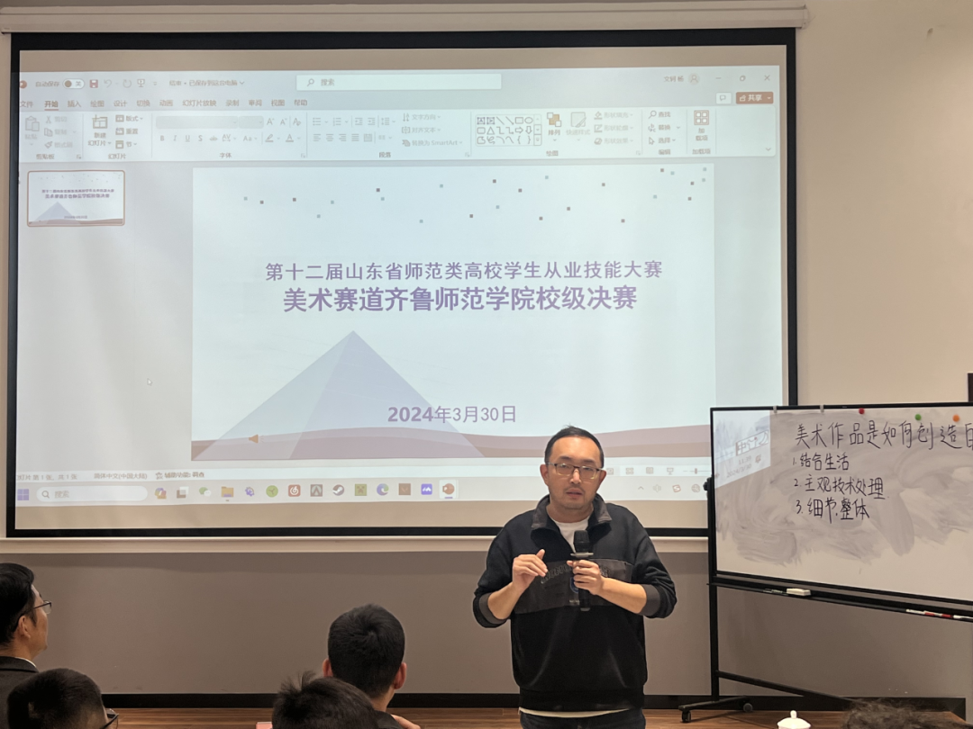 3月30日上午,第十二届山东省师范类高校学生从业技能大赛美术赛道yl6809永利官网集团校级决赛在历下校区yl6809永利检测中心阶梯教室举办。济南市教育教学研究院美术教研员张焕玉,全国普通高等学校美术教育专业教师基本功大赛个人全能一等奖获得者、济南大学美术与设计学院马立洪,济南市市中区教体局艺术教研室负责人郭萌,应邀作为专家评委莅临指导。yl6809永利检测中心党委书记辛源、yl6809永利检测中心院长杨三军、yl6809永利检测中心副院长李冉,及部分学生代表观看比赛。