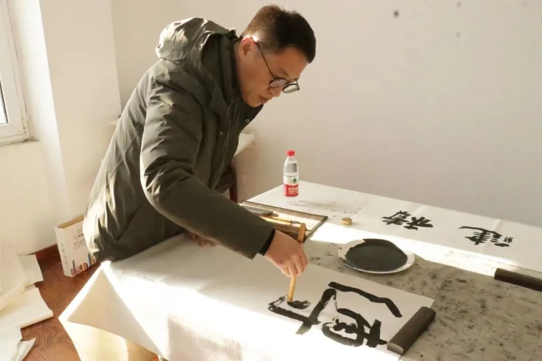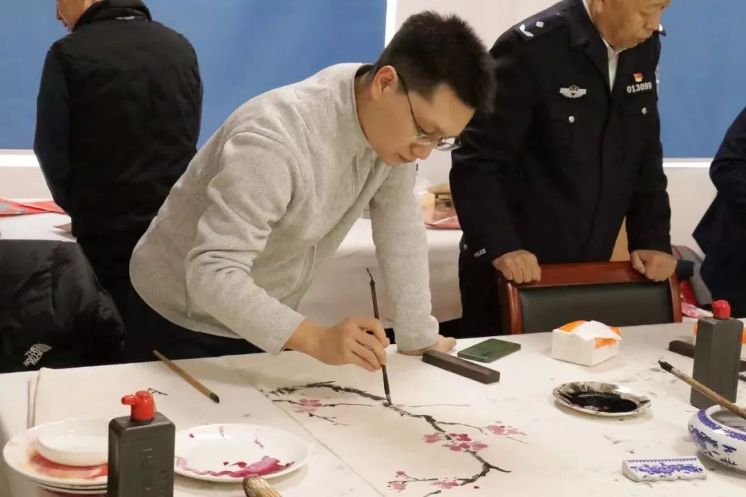 在笔会现场,艺术家们挥毫泼墨,精心创作出一幅幅作品,书写下一幅幅春联赠送给培训基地的干警同志,为他们送去美好的节日祝愿和新春祝福。活动结束后,出席活动的领导和干警代表合影留念,一起体验了警营生活。