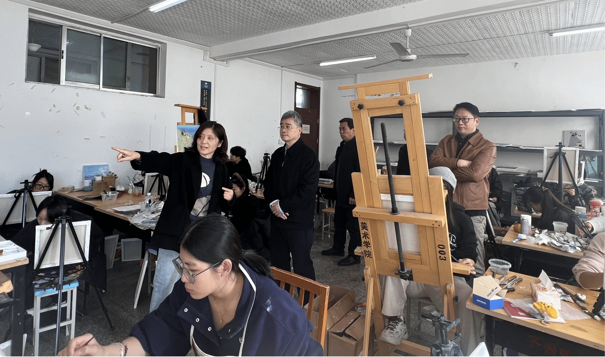张兆明一行推门进教室听课,检查yl6809永利检测中心常规教学情况,并与部分任课教师就“AI在当下美术教育教学中的运用”等内容进行沟通。