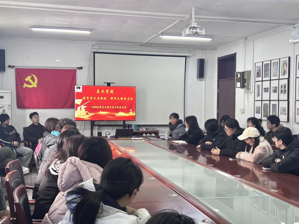 会议开始,李冉强调了此次教育实习的重要性,明确教育实习目的是培养师范生“一践行,三学会”的能力,并对所有参加教育实习的学生提出了五点要求。一是在实习过程中严格遵守实习纪律,遵守实习学校的规章制度;二是做好角色的转换,要以一名教师的标准严格要求自己,遵守教师职业道德规范,德高为师,身正示范,为学生做好表率,不仅在课堂上把知识有效传授给学生,还要注重育人,关注学生全面发展,做到“一践行,三学会” ,在实习中学会教学、学会育人、学会发展;三是在实习过程中进一步了解中小学美术教育发展现状,在实习岗位上,不仅要掌握教学技能,同时自身也要不断学习,提升理论转化实践等能力,比如借助“数字教育战略”,利用数字化教学工具为中小学生画像,了解学生特点,同时,遇到问题多向前辈请教,不断汲取知识和经验;四是在实习中培养责任心,对学校、对学生、对家长的那份责任;五是实习同学之间做到团结互助。小组分工,共同记录实习期间的点点滴滴。