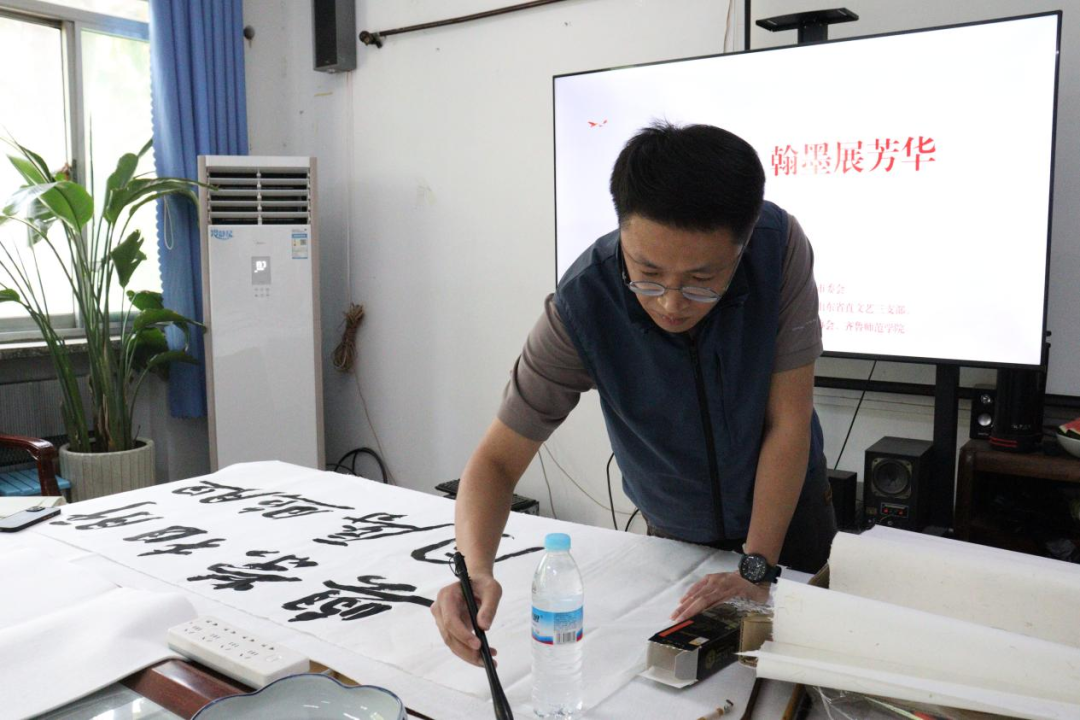 在两位领导的精彩致辞后,笔会正式拉开帷幕。书画家们齐聚一堂,挥毫泼墨,笔会现场将呈现山水、花鸟、书法等多元创作。孔维克以雄浑笔墨勾勒山河气象,赵英水的花鸟画融传统意境与时代生机,尹沂明的山水长卷尽显家国情怀,青年画家则以创新笔触注入当代审美。“不忘初心”“团结奋进”等书法作品笔力遒劲,每幅作品都承载着对党的祝福与文化传承的使命。