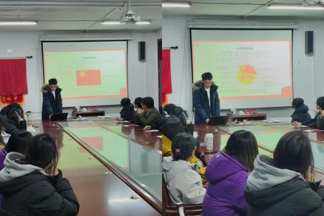 培训伊始,党团部同学结合《中国共产主义青年团团旗、团徽、团歌使用管理规定》,通过图文讲解、案例分析的方式,详细阐释团旗团徽的设计内涵、使用场景及规范要求。从团旗悬挂的方位标准,到团徽佩戴的场合礼仪,再到违规使用的负面案例警示,让全体参会人员深刻认识到团旗团徽作为共青团象征和标志的庄严性,切实增强了大家规范使用团旗团徽的思想自觉和行动自觉。