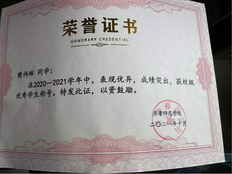 樊祎琳,2020级美术学油画班学生,群众,在校期间曾获校二等奖学金、校级优秀学生。现已考入南京信息工程大学美术与书法专业。她说,坚持了,努力了,没成功就加倍坚持加倍努力。