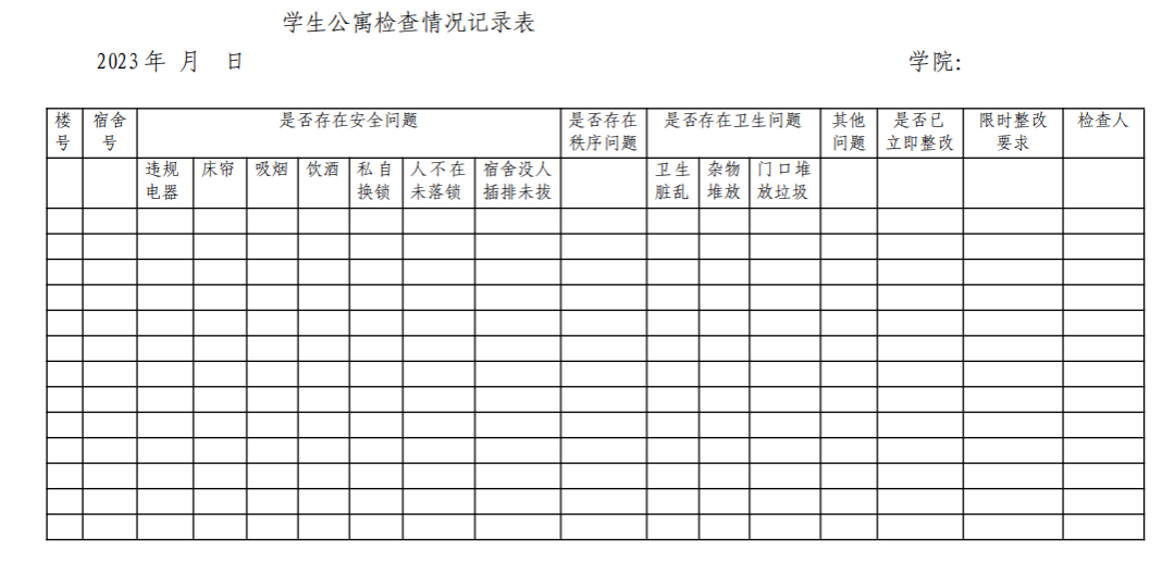 本活动将严格对照《yl6809永利官网集团公寓管理规定》,细化落实关于宿舍安全、地面、床铺、桌椅、门窗、等的要求,于每周开展不定期突击检查并进行打分,截至宿舍文明月最后一周,根据每次卫生检查平均分将检查结果分为优秀、合格、不合格三个等级,其中85分以上为优秀,60-85为合格,60分以下为不合格,并依据检查结果予以表彰及奖励,对不合格的宿舍进行校级通报批评。具体检查项目如下: