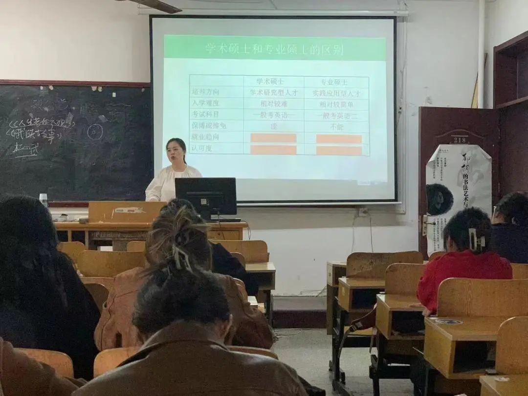 讲座伊始,马静老师从为什么考研这一问题入手,让大家对考研有了清晰的认识并意识到了考研的重要性。接着介绍了学硕与专硕的区别,细心解答了同学关心的如何择校的问题,她鼓励大家从个人兴趣、自身实力方面挑选适合的专业根据学校在这方面的教学质量择校,树立明确的考研目标,为大家拨开了考研路上的迷雾。