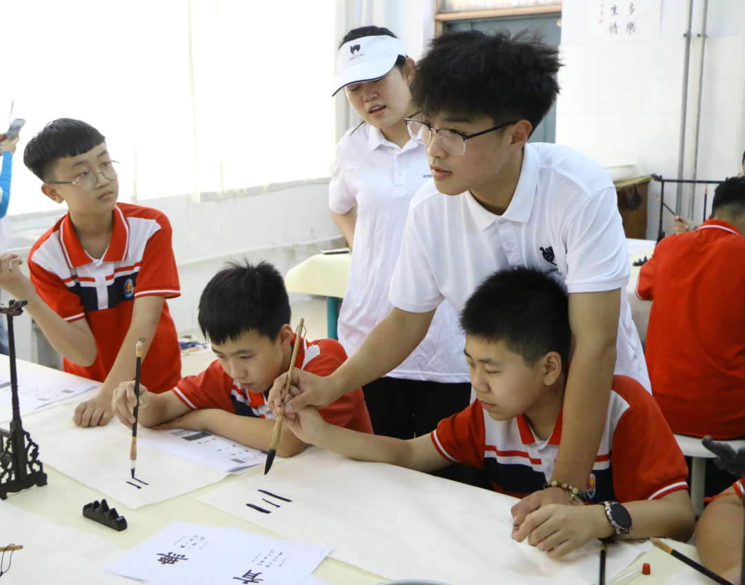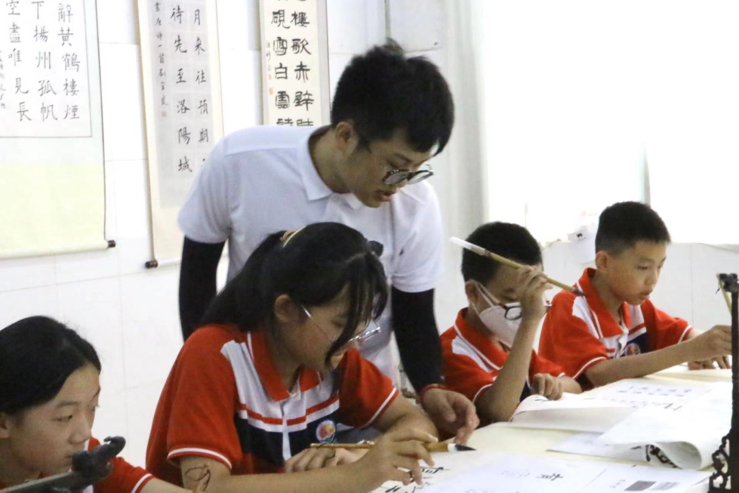 实践队队员带领好生初中同学们回顾建党百年来波澜壮阔的历史,向同学们传达坚定文化自信、坚守文化本根的使命,鼓励同学们要守正创新,勇攀高峰,为社会主义文化强国建设、创造中华文化新辉煌贡献书法力量,并将书写时手持笔的姿势与要点通过亲身示范的方式一一讲解。