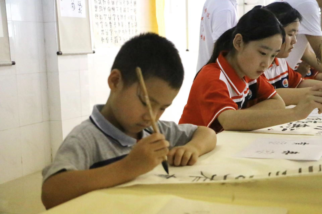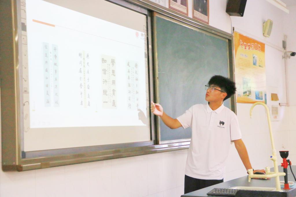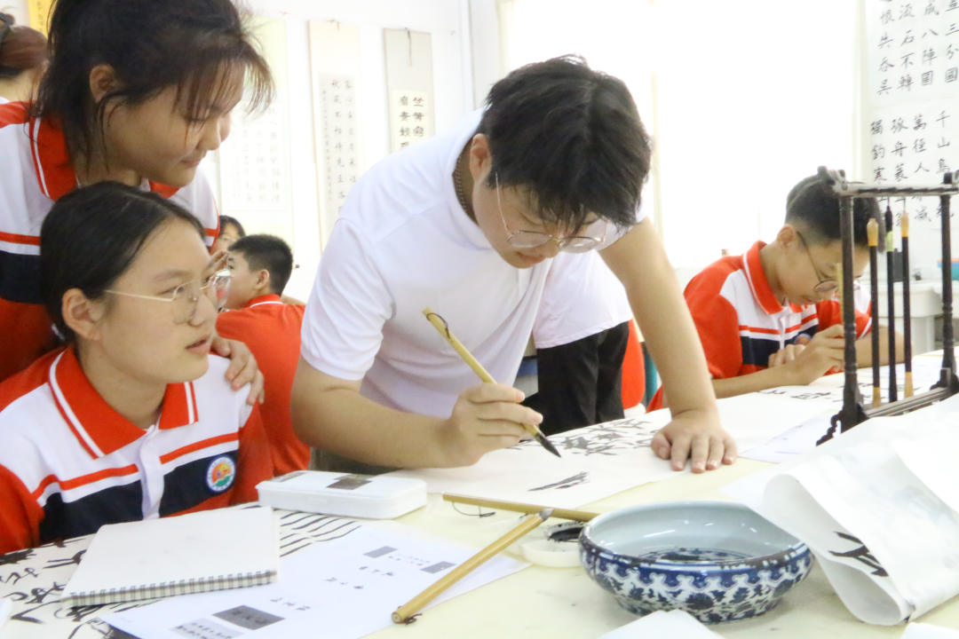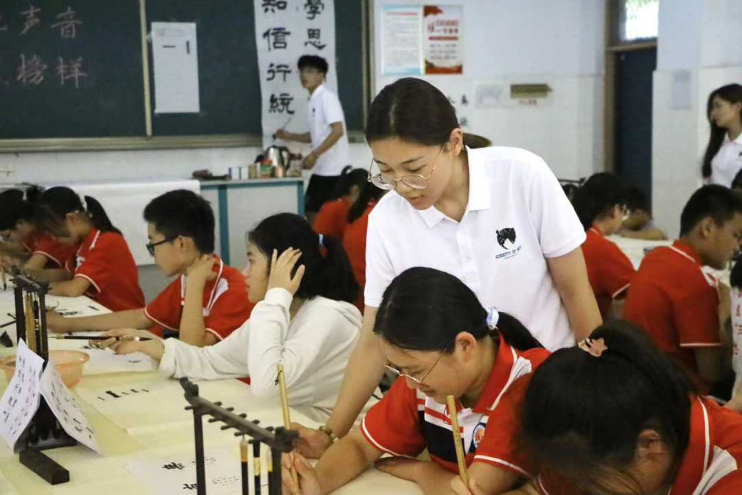 实践队队员耐心讲解书写要点,同学们聚精会神地临摹。他们的一笔一划书写的是中华文化,传递的是爱国情怀。随后,实践队队员纷纷走到同学们身边,细心解答疑惑,给予指导和帮助。