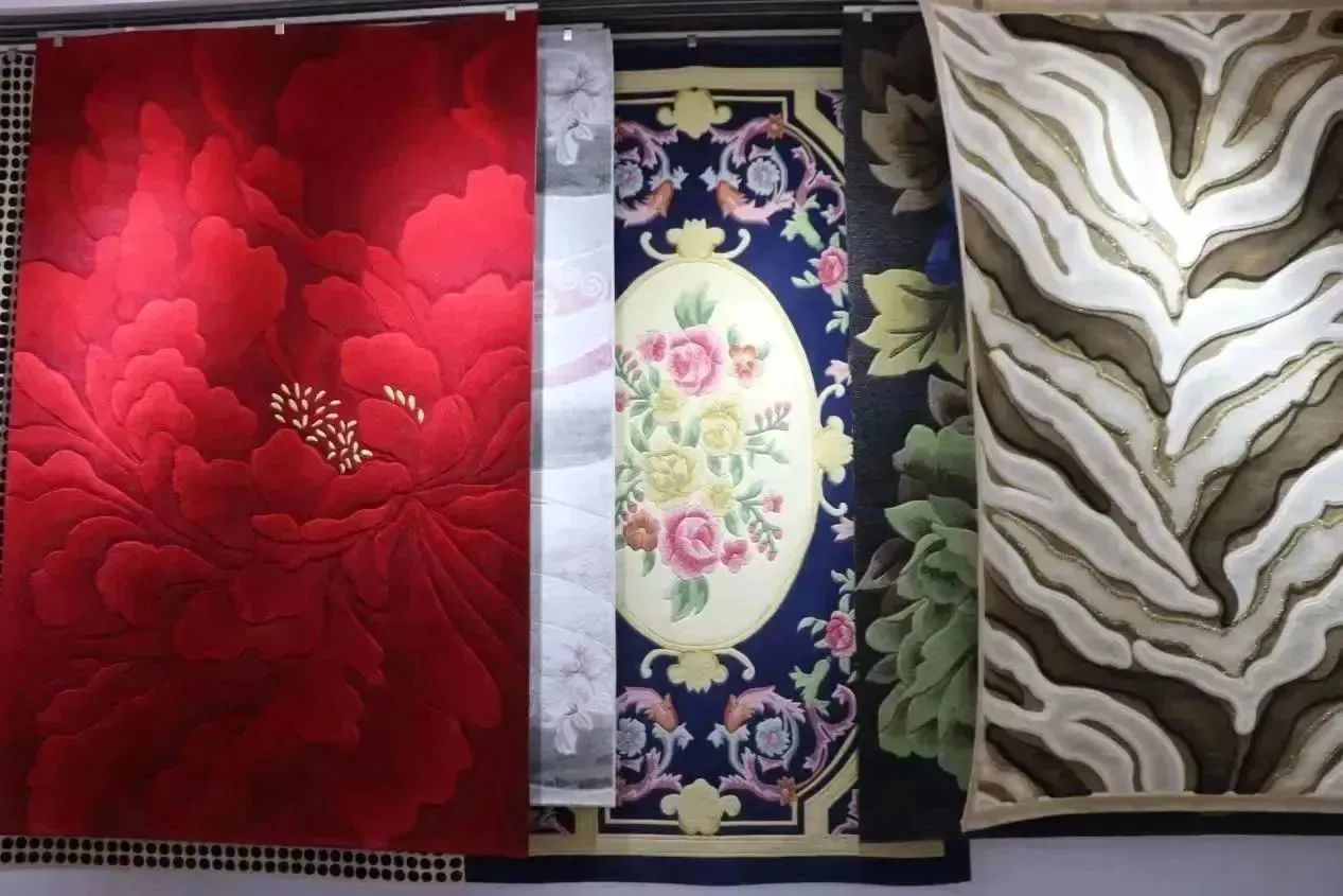 商河县孙集镇是远近闻名的“地毯之乡”,已有30余年的地毯产业发展史。占地400平的孙集镇地毯产业展馆充分挖掘非遗技艺,发扬壮大孙集镇的传统手工艺和非遗工艺。展馆门厅以多层次的几何引导进入展厅内部,花卉印花、几何印花的织物挂毯和地毯,为整个展馆平添了一份神秘的仪式感。展馆内承载着地毯电商直播的工作,让地毯工艺远播四方。