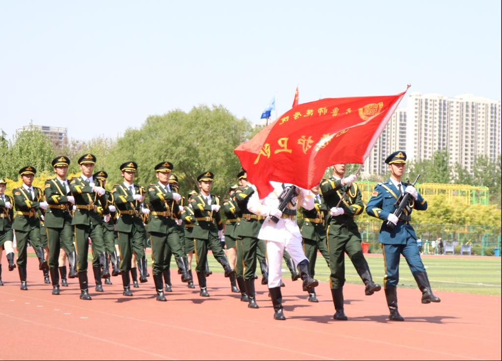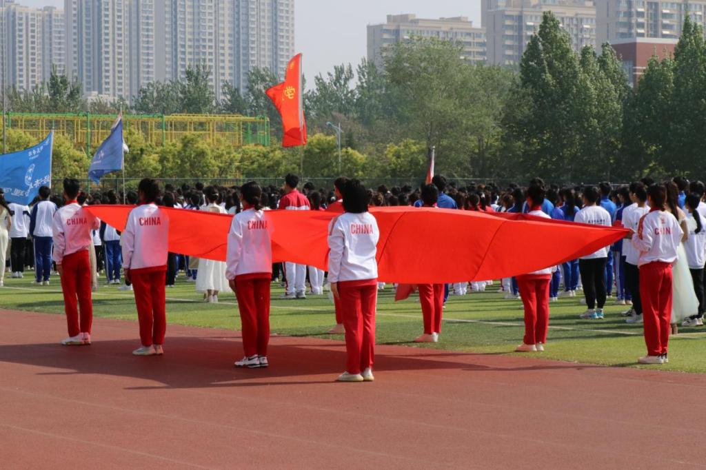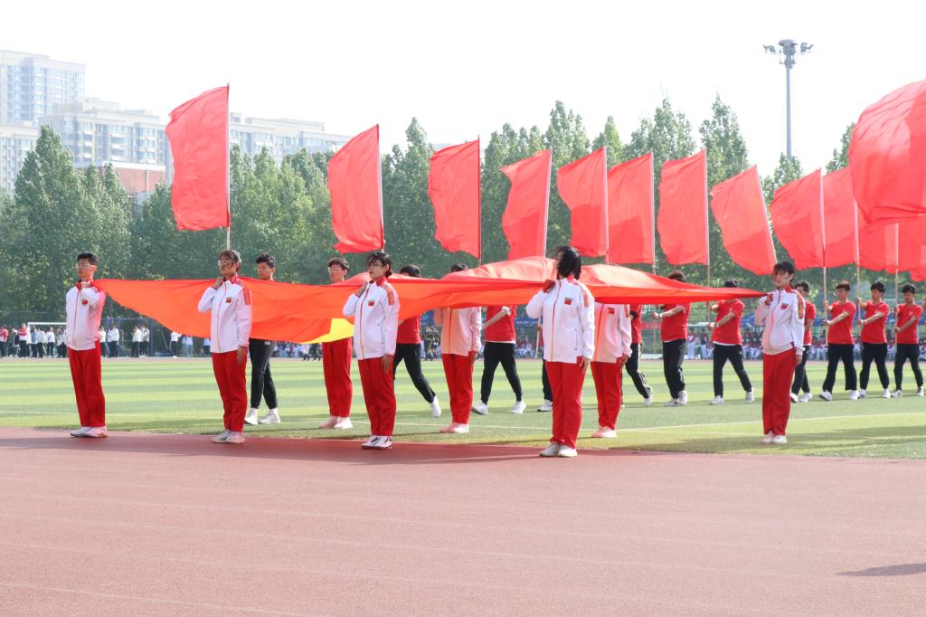 旌旗飞扬,群情鼎沸。伴随着激昂的音乐声,气势昂扬的护卫队携国旗缓缓入场揭开校运会的序幕。