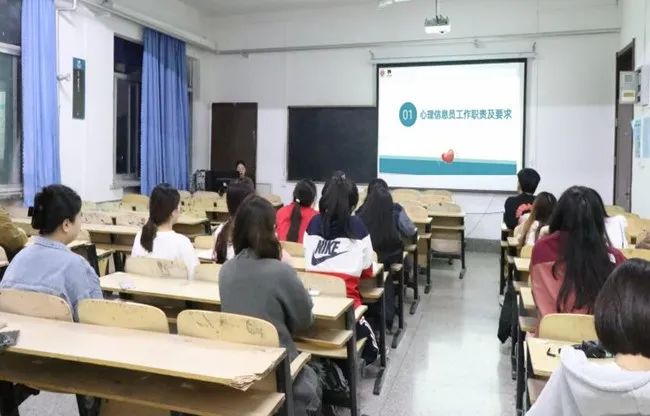 刘婷从“心理委员工作职责及要求”“大学生常见心理问题”以及“心理委员的工作技巧”等三个方面分别向心理信息员进行讲解。培训会上同学们聚精会神地听取并记录重要内容,增强其对理论知识的掌握,并从中正确理解了心理委员工作的重要性以及如何树立良好的责任感,明确自身使命。