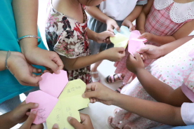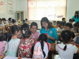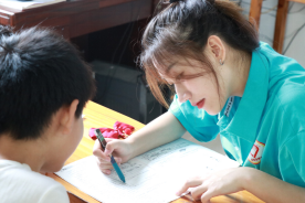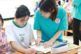 在所有的手工作品完成后,孩子们手里拿着手工爱心折纸作品,歪着小脑袋认真的写下自己的心愿。作品制作完成,孩子们纷纷高举着自己的手工作品,向志愿者们与小伙伴们展示着。一张张的心愿作品,饱含浓浓的师生情与同学情,有的孩子将自己的作品送给了自己喜爱的老师,有的仔仔细细整整齐齐地放在书包内,说要回去给最爱的爸爸妈妈。志愿者们发挥自身的专业特长,为孩子们上了精彩的手工一课,相信孩子们都能在活泼欢乐的课堂中学有所得,师范学子也能通过此次活动增长才干。在手工课结束后,青年志愿者又对孩子们的暑假作业进行了辅导,并督促他们完成今天的学习任务。