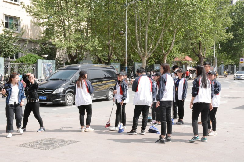 到了地点之后,同学们在周老师的带领下领取打扫工具,并分配任务,成立了小组。我们沿着火车站附近的街道、各个地方进行活动。