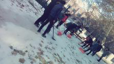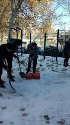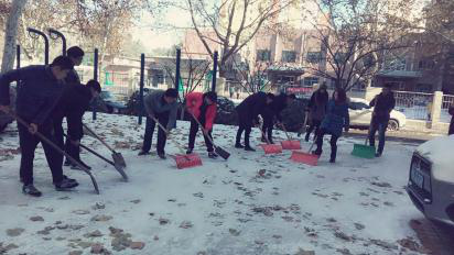 扫雪时,其他组织的学生干部积极响应学校的号召,投身于扫雪的队伍中。同学们躬着身子,握着扫把、铁锹,哈着白气,一铲一扫的把雪扔到路的两旁,积极迅速地投入到扫雪活动中来,全力清扫校园内主要出入道路上的积雪。由于积雪比较深,很多地方都结成了厚厚的冰,而且扫雪工具有限,这给扫雪工作带来的很大的困难。但是,同学们不畏困难,他们分工明确,有的同学负责拿大扫把清扫路面的积雪,有的同学负责拿铁锹铲掉结成的冰,铁锹声和同学们的话语声交织在一起,奏出一首和谐的劳动曲在校园内回荡。经过志愿者们和其他校组织成员齐心协力的努力,一条干净便捷的道路出现在原本白茫茫的雪地上,为过往的师生提供了便利。