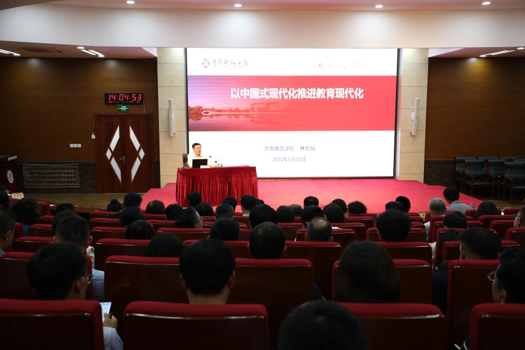 本次专题党课围绕学习贯彻习近平新时代中国特色社会主义思想主题教育展开,林松柏书记分别从中国式现代化的提出、中国式现代化的科学内涵、教育现代化的任务要求以及做出齐鲁师院贡献四个方面进行阐述。