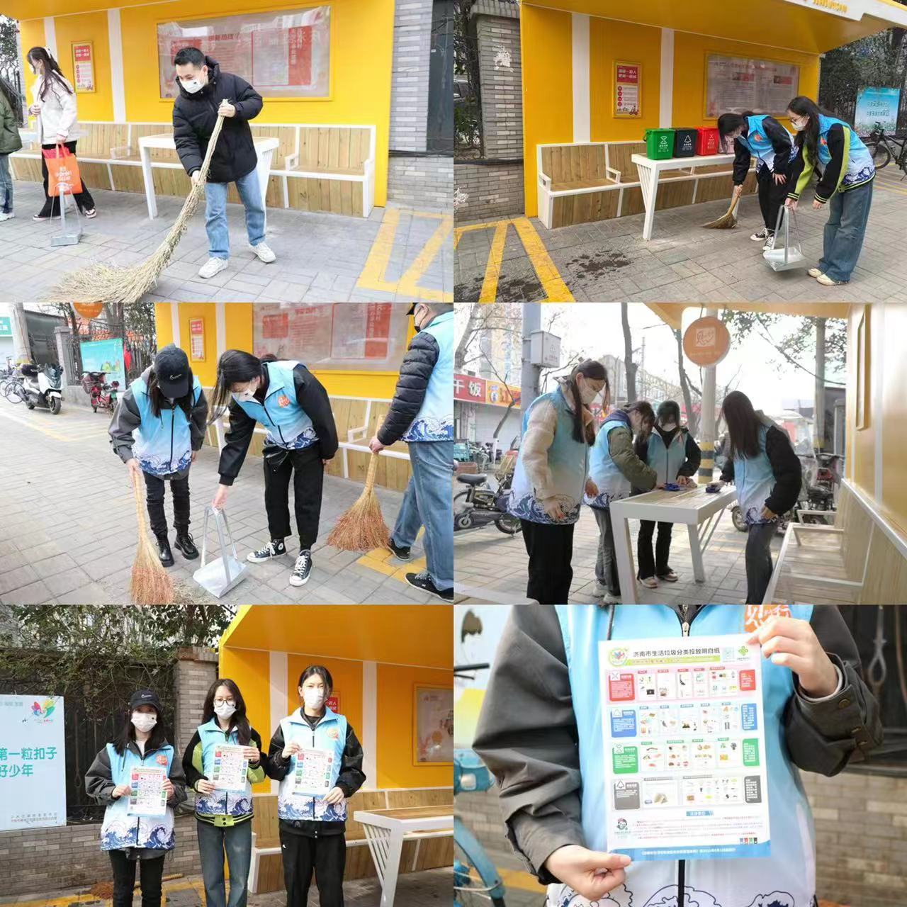 在外卖小哥休息亭,志愿者们分工合作,清扫地面、倒垃圾、擦桌子、擦板凳,向过路行人发放《济南市生活垃圾分类投放明白纸》,现场秩序井然。工作中,外卖小哥还时不时传来一声声谢谢,向志愿者竖起一根根大拇指,这也深深地触动着志愿者们。