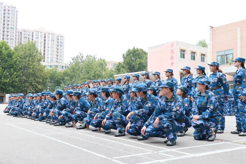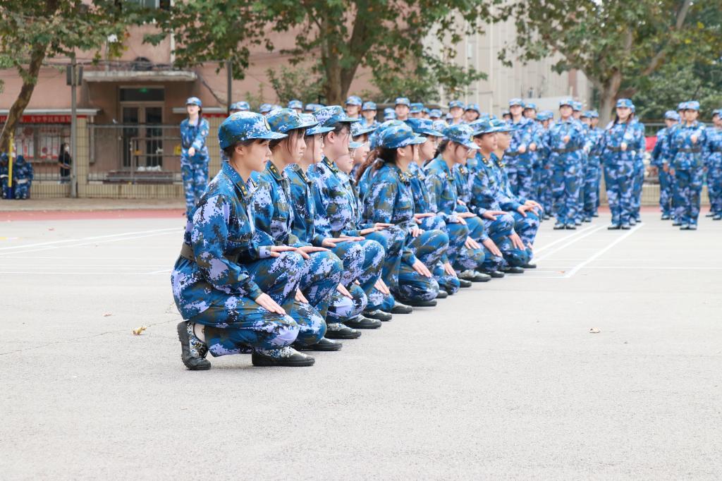 军事训练在下午两点半正式开展,各教官向同学们进行自我介绍,同学们表示热烈的欢迎,随后新生们进行了整理仪容仪表、四面转法、蹲下、跨立、稍息、齐步走、解散、集合的训练,教官详细地向他们展示了这些训练的基本动作,并不断纠正学生们在动作上的细微错误。