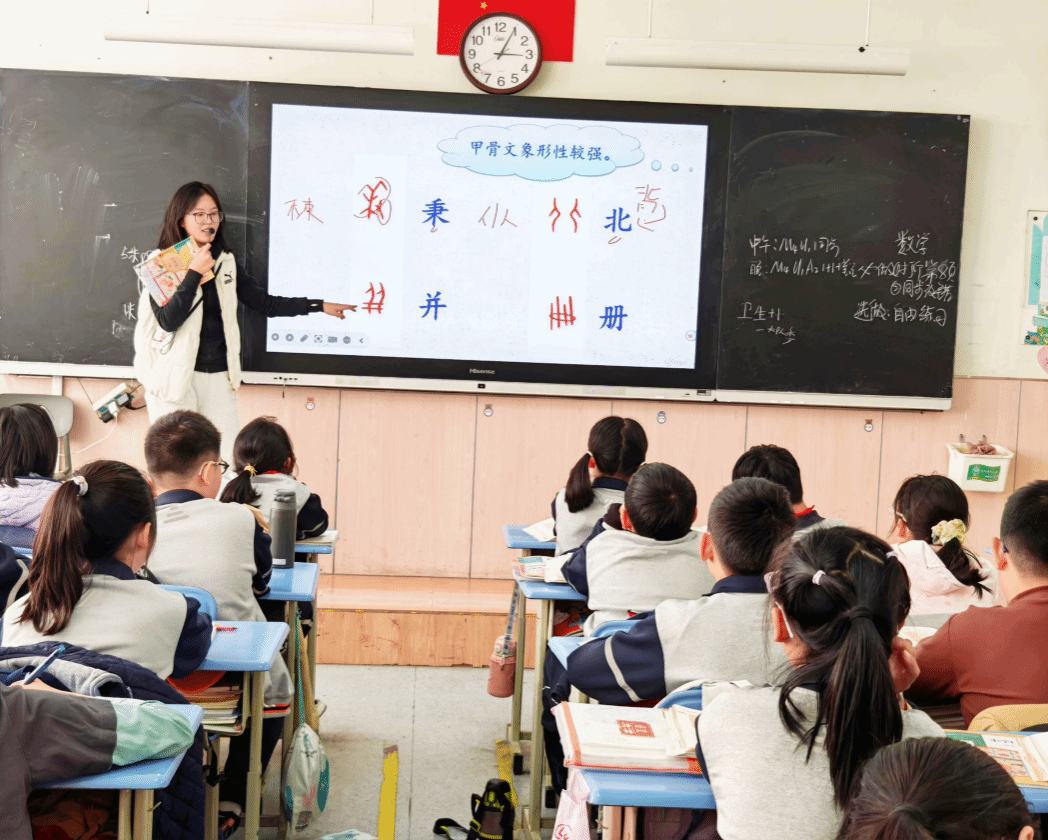 书法一班王信鉴同学在青岛某小学实习期间,将雷锋“干一行、钻一行”的敬业精神融入低年级书法启蒙教学。课堂练习中,她发现有学生书写基础薄弱,便进行针对性辅导,用浅显易懂的语言引导学生规范书写。她以雷锋“对待工作要像夏天一样火热”为准则,用真诚与热情对待每一位初学写字的孩子。