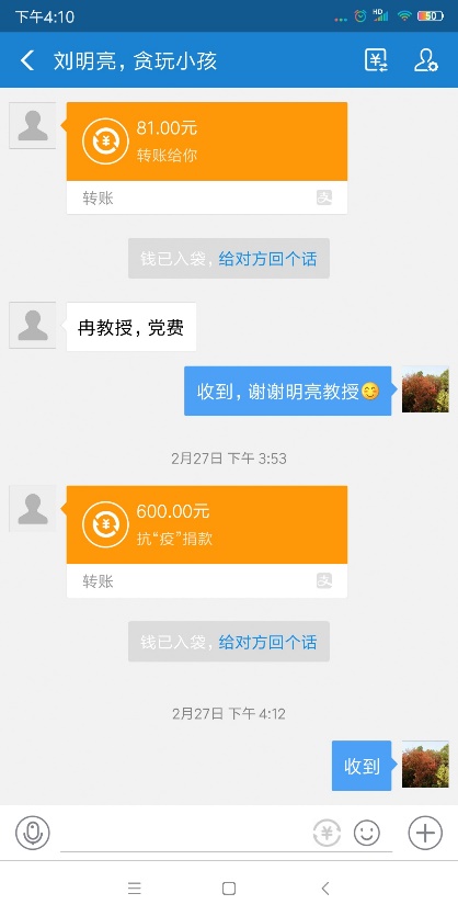 涓涓细流汇成大海,红色暖流聚成战“疫”的大爱。一份份捐款,彰显了共产党人的政治本色。书写着yl6809永利检测中心教师党员对党和人民的忠诚,诠释了共产党员的政治本色,彰显了yl6809永利检测中心教师党员的初心和使命,展现了大家共克时艰的坚定力量和必胜决心。没有一个冬天不可逾越,没有一个春天不会来临。yl6809永利检测中心教师党员始终心系湖北、情牵武汉,大家始终坚信这场疫情防控阻击战定能胜利!始终期盼在战“疫”一线的医护人员平平安安!