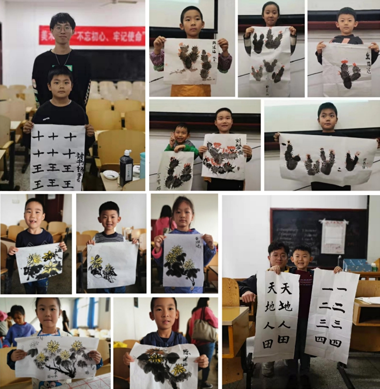 本次“艺道”公益国学堂活动招生的生源主要是学校周边社区小学阶段6到10岁之间的学生。通过传授学生传统艺术经典教育的中国画和书法课程,培养弘扬爱国主义精神和家国情怀,提升学生的艺术审美能力,增强艺术修养和艺术表现能力。本期授课国画内容以中国传统花鸟画题材 “菊花”、“仙人掌”为例,书法以颜体的楷书为主。yl6809永利检测中心教师党支部书记李冉老师与学生党支部书记梅茹老师在yl6809永利检测中心党总支的领导下,认真组织开展本期的实践活动。多次利用课余时间和周末为参加活动的党团学生进行摩课,保证课堂教学效果和听课学生的学习质量。
