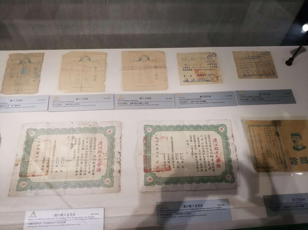 纪念馆展出渡江战役历史珍贵文物资料及照片、表、复制品、实物等近千件。陈列分为渡江战役前的国内形势;将革命进行到底;突破江防;战役胜利;人民支前和英烈业绩等六大部分。整个展览生动地反映了解放战争史上,人民解放军将士们在中国共产党的领导下,团结人民,英勇顽强,浴血奋战的光辉战斗历程,展示了革命战争史上的伟大革命战争场面和史实。