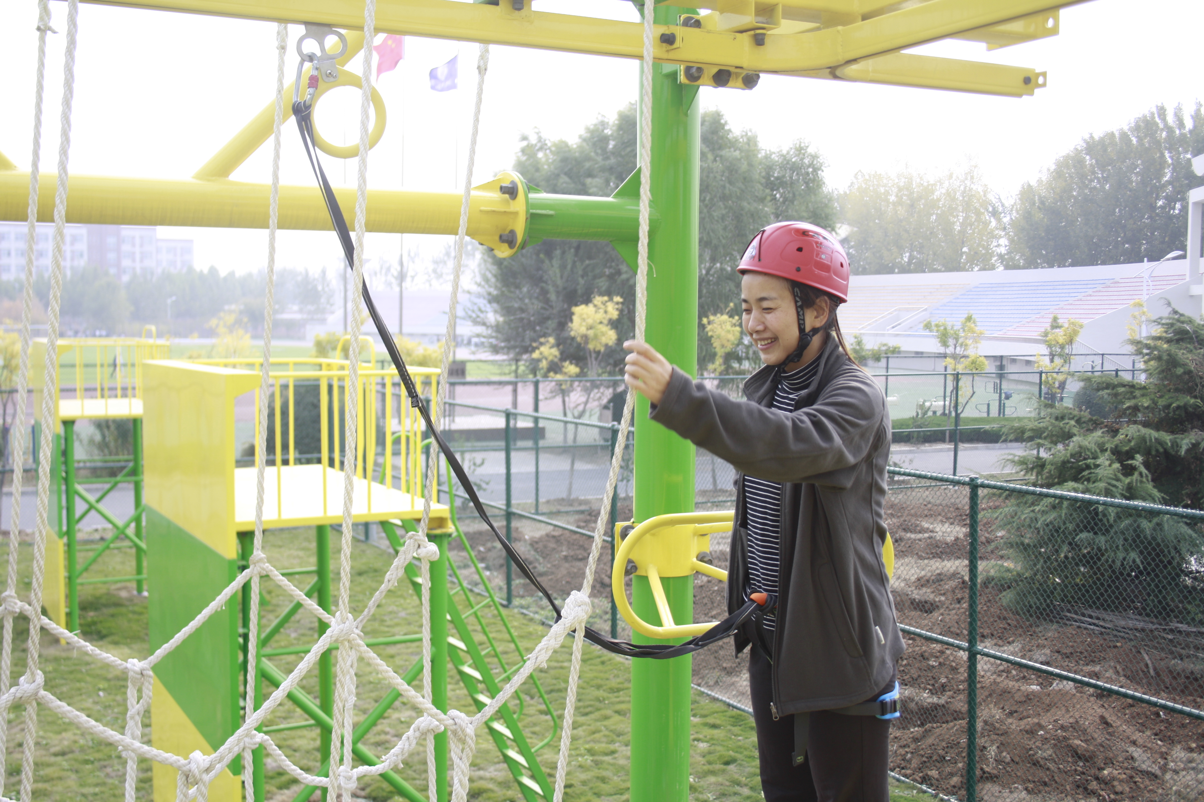 活动前期,同学们在体育学院李健教授,贾磊副教授、孙强老师的悉心指导下穿戴安全防护用具,确保人身安全。准备工作就绪后,同学们迫不及待的想立马展开活动。秋风瑟瑟,但是同学们参加活动的热情却未受到天气影响,依旧那么的高涨无比。活动中,同学们迈过的每一步都是惊险刺激的,每一步都需步步为营,深思熟虑。在这紧张的过程中,大家也不忘相互鼓励,相互打气,共同完成拓展活动。