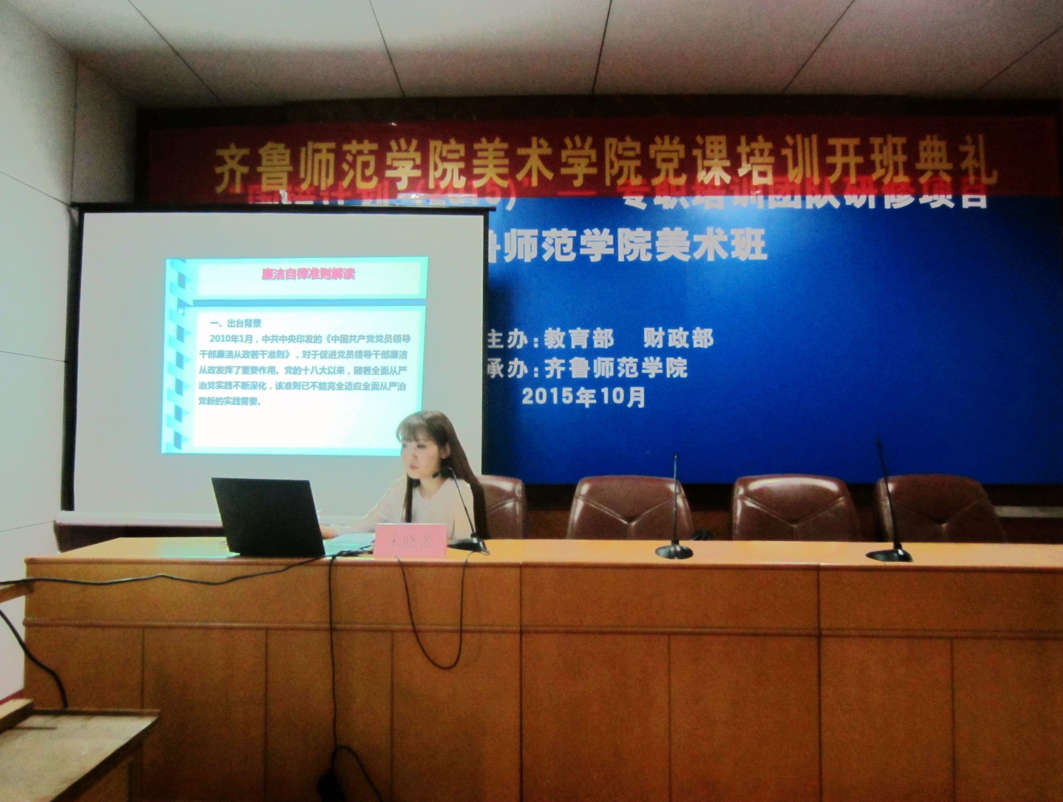 辅导员臧晓琳老师、杨雪涵老师、宋晓蕾老师分别从胡锦涛总书记的十八大报告、“端正入党动机坚定理想信念做合格共产党员”、《中国共产党廉洁自律准则》等几个主题,为大家进行了详细的解读,使大家有了更深层次的理解。几位老师也对参加此次学习的入党积极分子提出了几点要求,要求大家提高自己的党性觉悟,做一名合格的入党积极分子。