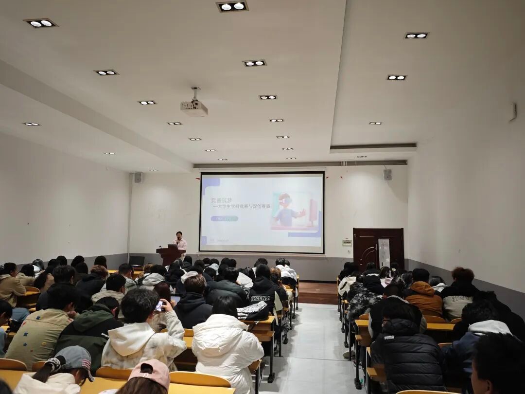 同学们围绕各类大赛展开了热烈讨论,大家你一言我一语,有人兴奋地分享自己对参赛项目的初步设想,有人则在交流组队的意向,现场气氛热烈而欢快。