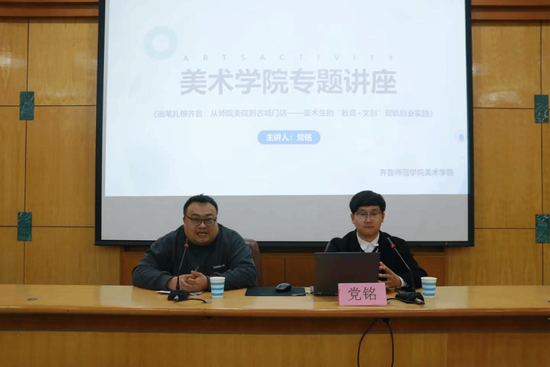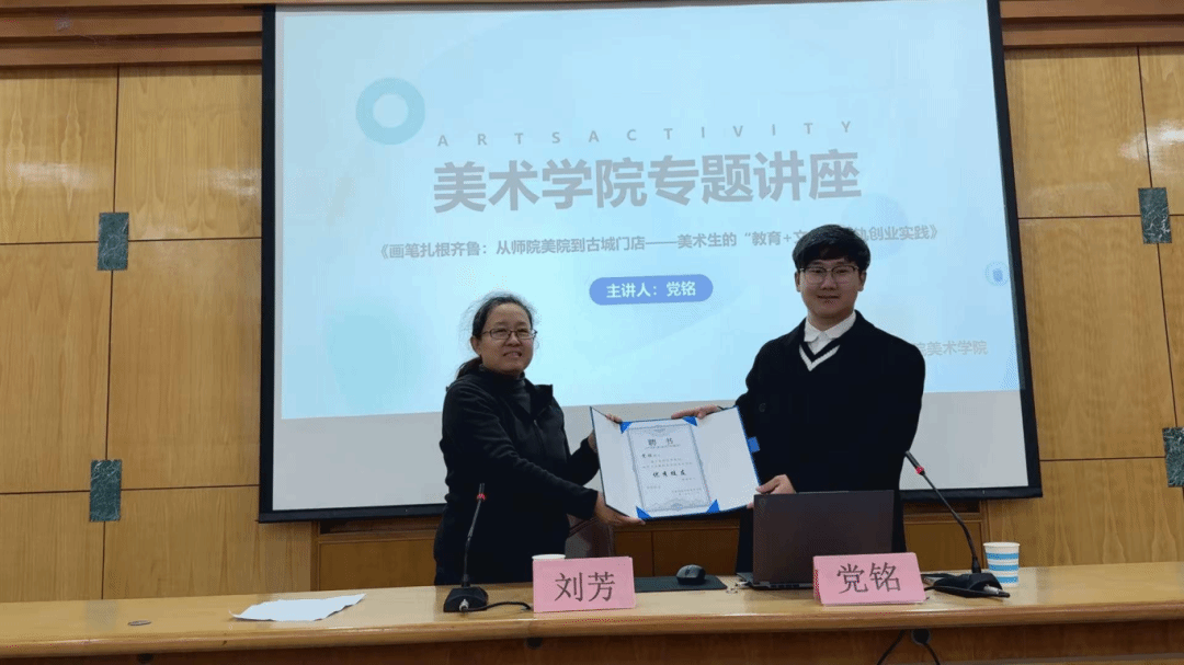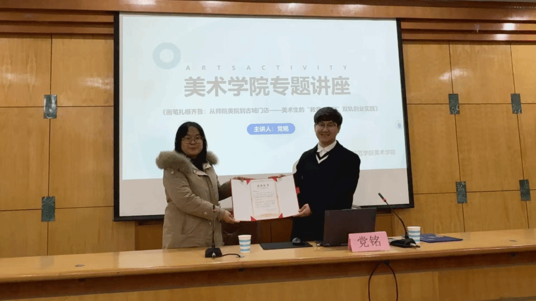 在校友分享环节,党铭结合自身从专业绘画到创办教培、拓展文创与新媒体的经历,多角度解析职业发展。他深入剖析美术教育的核心,强调教学需贴合学生发展规律、激发创新思维。他以运营明水古城文创店、引入手工项目为例,阐述如何依托专业进行创业。同时,他还分享了多位校友结合家乡非遗成功创业的案例,鼓励同学们提前规划,学以致用。