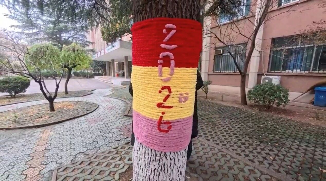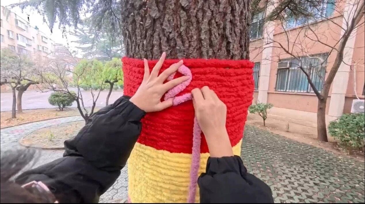 暖阳之下,躬身筑暖。活动当日在教学楼前,同学们分组协作,先取朱红、鎏金、柔粉三色毛线,循着树干肌理细细缠绕。朱红似元旦檐角的灯笼,灼映岁末欢悦;鎏金若晴日散落的碎光,驱散冬日清寒;柔粉如枝头初萌的花苞,漾着青春温婉。三色丝线经纬交错、层叠缠绕,既为遒劲枝干增添冬日暖意,又在光影流转间晕染出灵动雅致的色彩纹路。更有巧思学子撷取彩线,以朱红衬底作骨、鎏金勾边塑形、柔粉点缀其间,编缀出棱角分明的“2026”字样,让新岁印记与草木生机浑然相融。