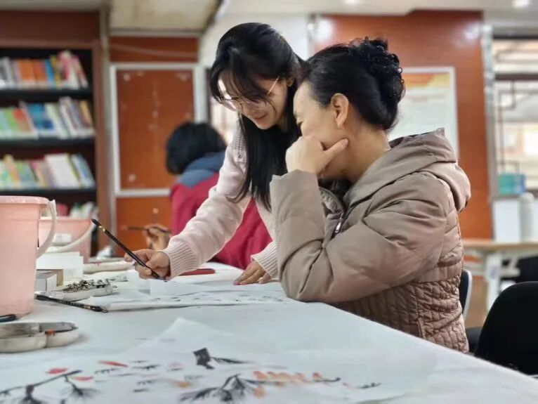 走出专业教室,走进社区活动室,2023级美术学国画班的同学们用近一年的坚持,为社区中老年人搭建起接触传统艺术的桥梁。从最基础的握笔姿势、水墨调和,到花鸟、山水等题材的构图与创作,同学们摒弃“单向授课”模式,而是根据老人们的学习节奏调整教学内容,手把手示范运笔技巧,逐幅点评习作细节。