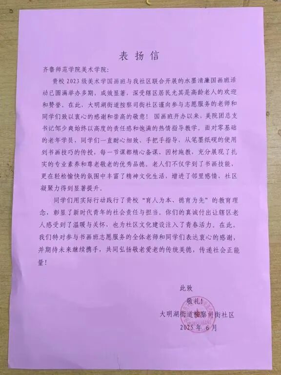 这份用心与担当,不仅让美育课堂充满温度,更赢得社区的高度认可。此前,社区已送来表扬信,称赞同学们“用专业服务社区,以行动传递正能量”;近期,又专程送来印着“国画雅韵伴暮年,志愿真情暖邻里”的锦旗,这份认可,既是对同学们志愿服务的肯定,更是对校社携手传承文化的鼓励。
