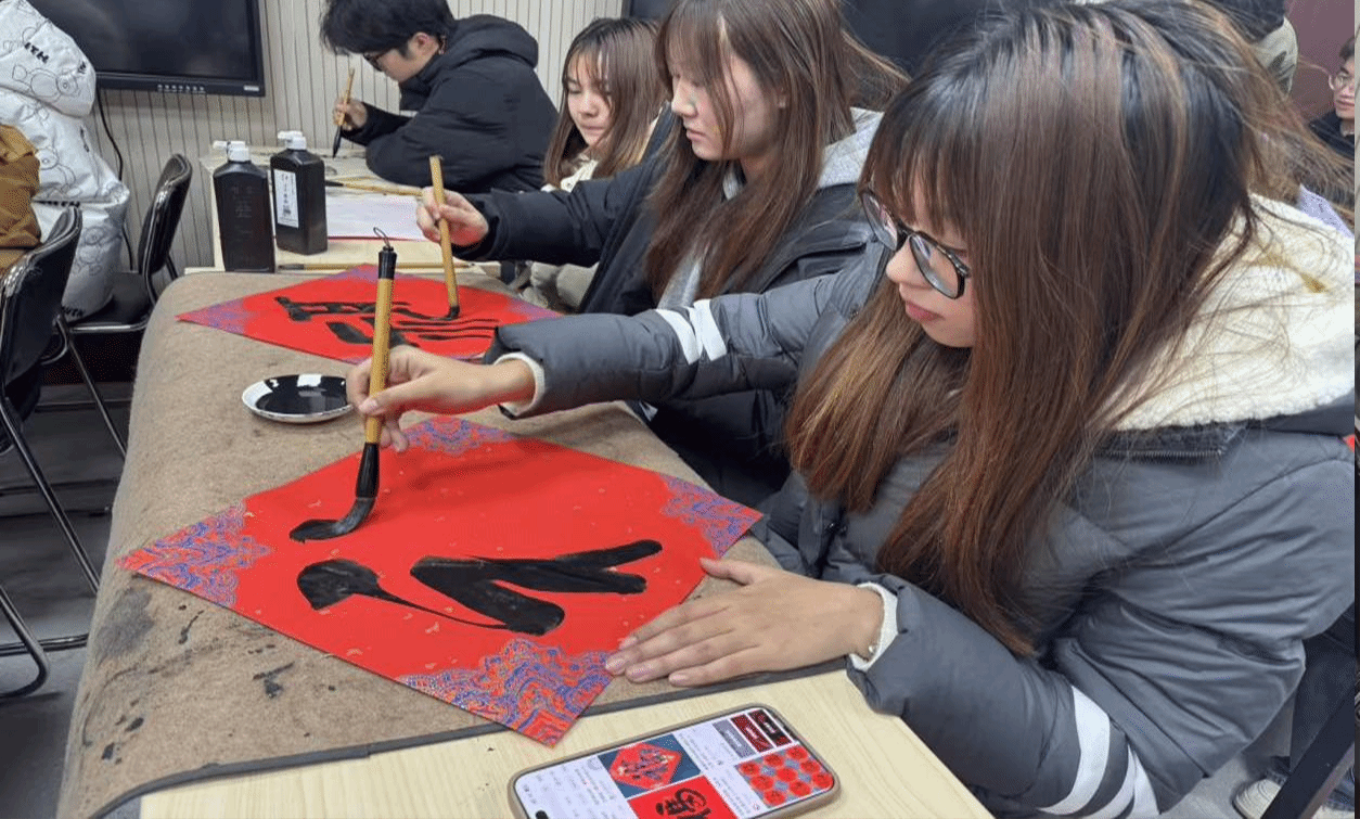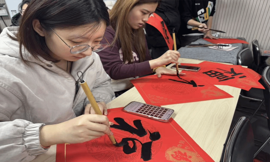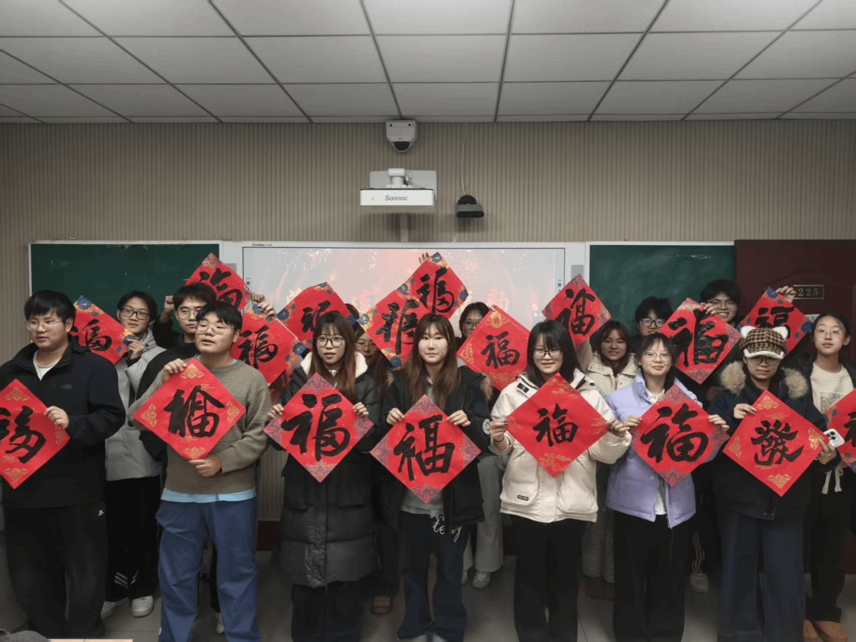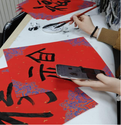 活动现场墨香四溢、暖意融融。美院学子挥毫泼墨,一笔一画间尽显美院君子之艺的魅力。 吉庆红笺,一个个饱满圆润、寓意吉祥的“福”字跃然纸上,既承载着对台湾同胞的新春祝福,也饱含着对两岸繁荣发展、团圆和睦的殷切期盼。