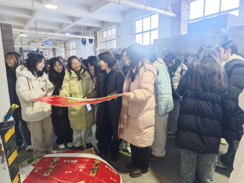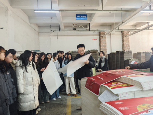 对包装设计“美观性、环保性、实用性”的三重诉求。随后,副总监史兆顺带领大家走进工厂车间,在现场为大家介绍不同材质的特性差异和烫金、覆膜等工艺的实际应用效果,最后大家与现场设计师交流“如何平衡创意表达与生产可行性”“人工智能在包装设计中的实操场景”等专业问题,将课堂理论与产业实际精准对接。