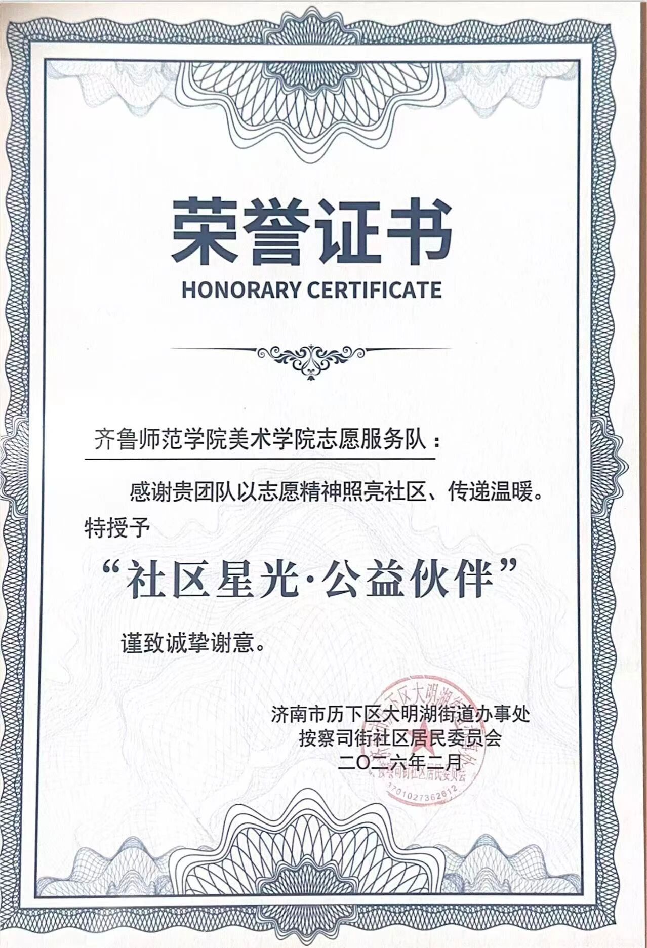 活动现场环节紧凑、暖意满满。从主持人营造“家宴”般的开场氛围,到社区书记致词传递共治初心;从为“幸福合伙人”颁发致敬证书的荣誉时刻,到“2026共建心愿树”前各单位认领微项目的互动场景,每一步都彰显着“携手筑幸福”的理念。学院作为“幸福合伙人”之一,以艺术传递温暖,让传统文化浸润生活。