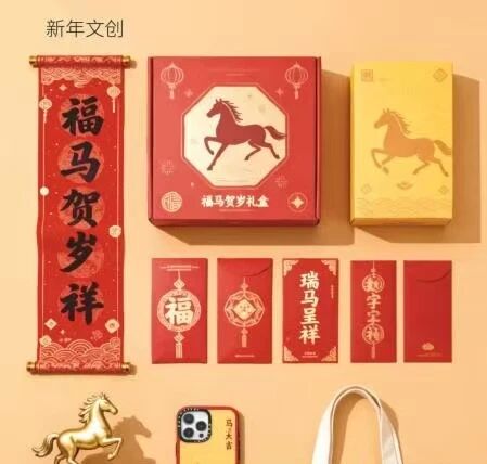 2025级工艺美术班毛语桐以“骏风纳福”为核心主题,结合马年生肖文化与春节礼赠场景,打造兼具传统年味、视觉美感与实用功能的礼盒产品,搭配红金配色与骏马图案,辨识度高,兼顾质感与性价比,具备明显差异化优势。
