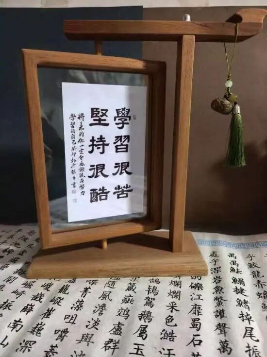 2025级美术学国画班郜若冰以中式美学与当代实用结合,选用原木作为主体材质,保留木材的温润质感,搭配榫卯式的支架结构,是对中式传统家具工艺的致敬。上方的挂架既可悬挂流苏挂饰增添雅致感,又能稳定支撑相框,让它既是一件实用的展示工具,也是一件有东方韵味的桌面摆件。把“自我提醒”转化为具有仪式感的物件,在传递正能量的同时,也提升了桌面的文化氛围。