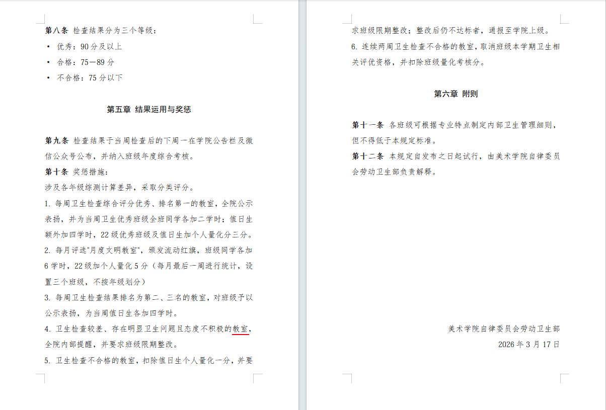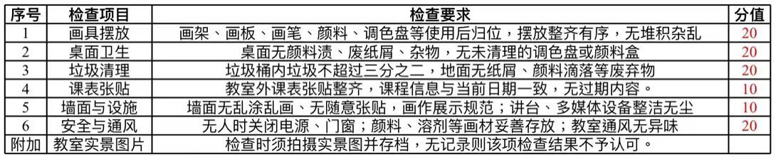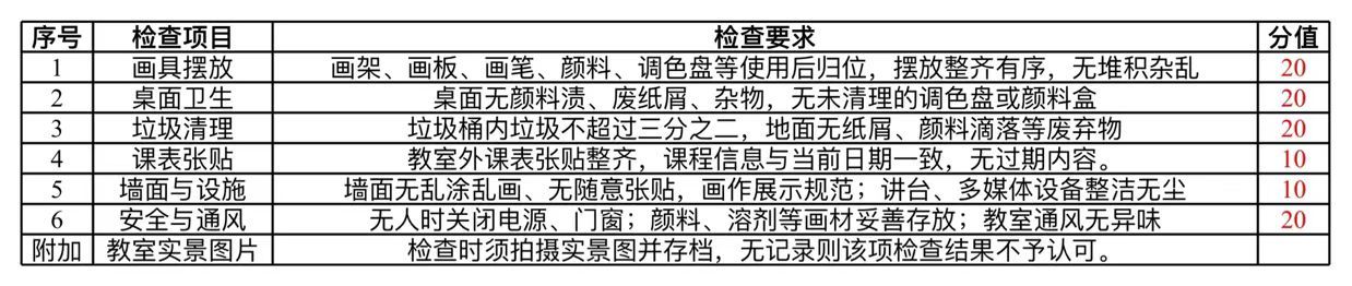 新规在原有基础上进行了系统优化与完善,主要包括以下重点内容:一是扩大管理范围,将公共教学空间纳入统一管理,实现专用教室、画室、工作室全覆盖;二是强化安全与通风要求,在“规范有序”的基础上新增“安全整洁”原则,重点加强画材堆放、电器使用及教室通风情况的监督;三是优化检查流程,增加抽查环节,提升检查工作的质量;四是建立激励机制,设立“月度文明教室”评选,每月评选三个优秀班级,颁发流动红旗并给予学时奖励;所有检查结果将纳入班级年度综合考核,进一步增强各班级的卫生管理意识。