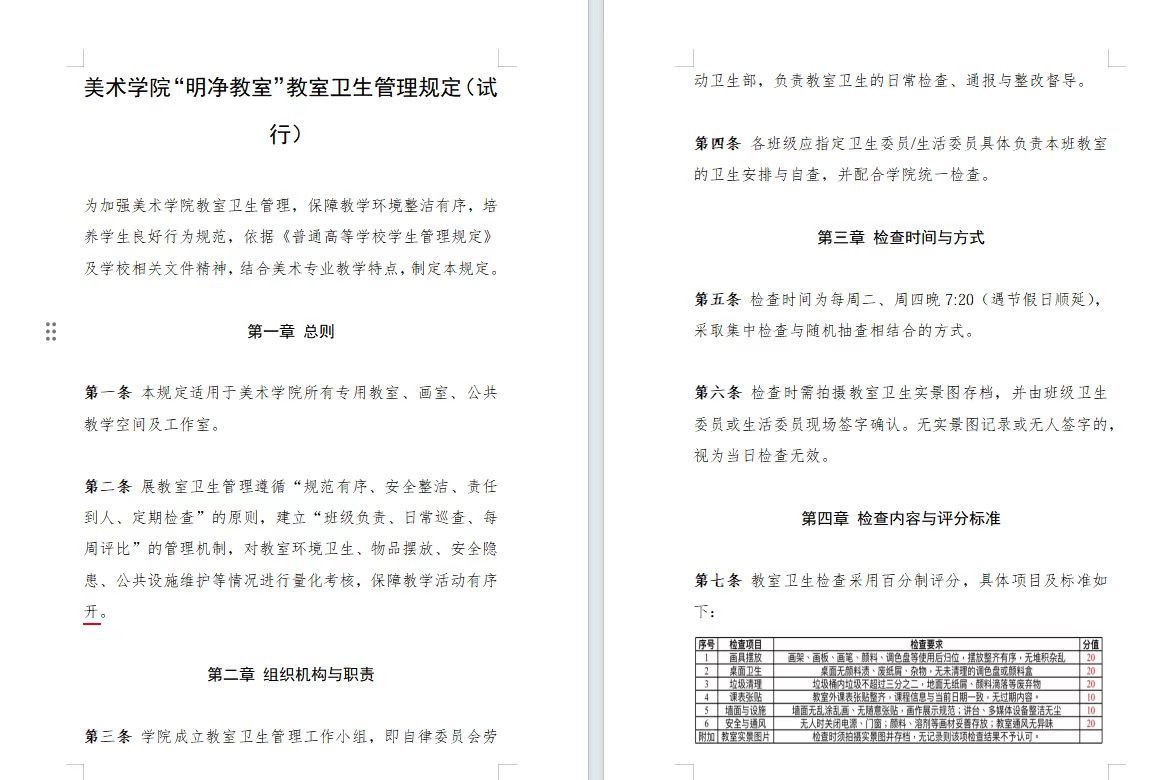 为加强yl6809永利检测中心教室卫生管理,保障教学环境整洁有序,培养学生良好行为规范,依据《普通高等学校学生管理规定》及学校相关文件精神,结合美术专业教学特点,制定本规定。