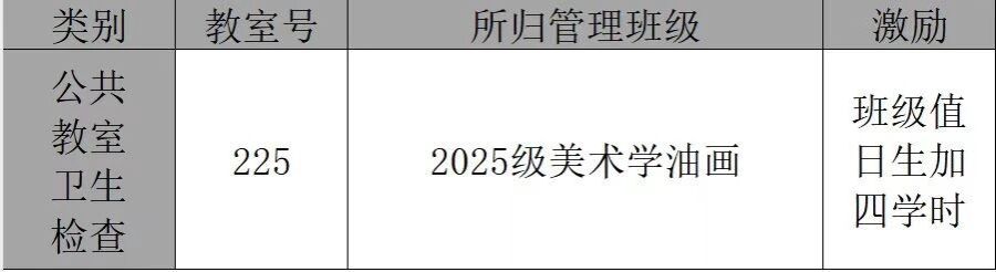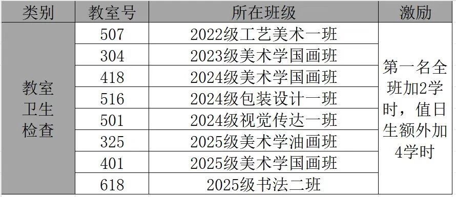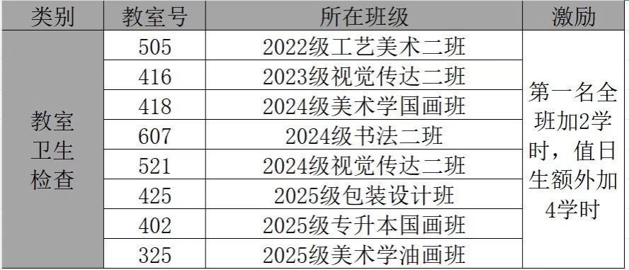 综合评定,学院前三名的班级,全班同学加6学时,劳动卫生部将对荣获“月度优秀教室”的班级授予卫生流动红旗。
