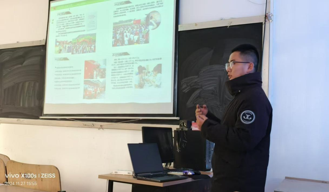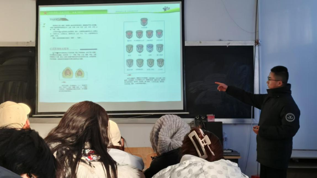 会议伊始,国防社负责人申超讲述本次活动,他展示了军营里真实的照片和视频,以此来让同学们了解军队里的生活。随后详细解读本地征兵政策,包括入伍条件、优待政策、退伍安置、军营生活、军事常识等方面,特别提到对大学生参军的一系列优惠政策,如学费补偿、升学加分等。申超也分享了军旅生涯,讲述了自己在艰苦的边疆服役期间的难忘经历,以及军旅生活对个人意志品质的磨炼,鼓励有志青年投身军营,以亲身经历感召适龄青年勇敢参军。