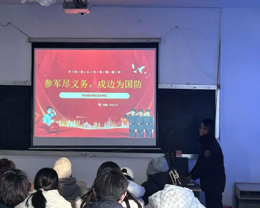 本次活动深入探讨了“参军尽义务,戍边卫国防”的重要意义,提高了适龄青年对参军戍边的认识和积极性,为后续征兵工作的顺利开展奠定了良好基础。活动结束之时,孟令强号召美院青年们积极参军,在边疆的土地上,挥洒热血,砥砺前行,为国防事业添砖加瓦,让青春在卫国戍边中绽放最绚烂的光彩!