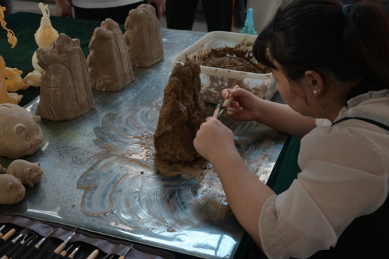 通过讲解以及参观博物馆非遗工作室,队员们了解了聂氏铜器铸造技艺的制作流程。历代传承人通过灌蜡模、精修蜡模、高温着色等工序展示传统工艺的深厚底蕴和匠人们精湛的技艺,每一道工序都凝聚着传承人的匠心与智慧。