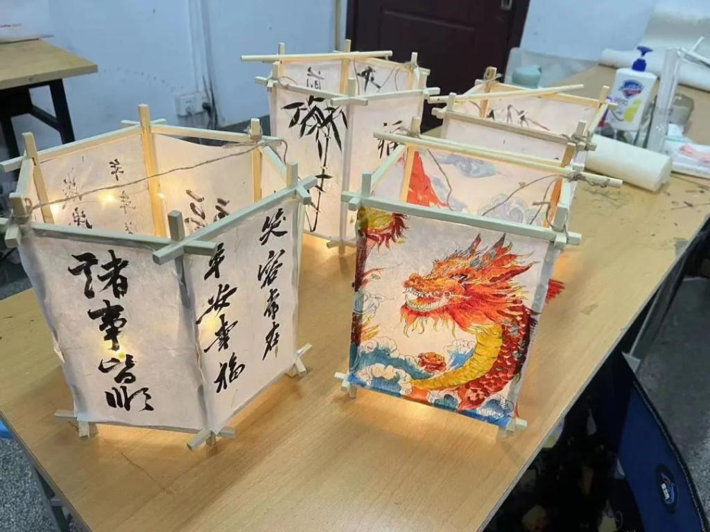 社团成员分工协作,将木筷首尾相接,交点处使用热熔胶或棉线缠绕固定,搭建出灯笼初始骨架。利用学科专业素养,同学们进行创意创作,将完成好的灯罩粘贴在灯笼的骨架上,用热熔胶或棉线固定。