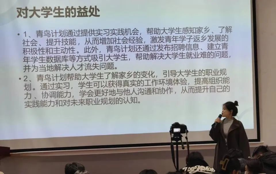 活动伊始,王洋洋详细介绍了青鸟计划的实施背景和深远意义,强调其对于青年大学生成长发展的重要性,鼓励同学们积极投身实践,在青鸟计划中找到属于自己的方向。