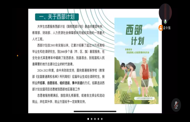 本次宣讲围绕西部计划是什么、报名条件、报名流程、政策支持、资金保障等方面展开,强调了选拔流程,鼓励同学们只要怀揣热忱、具备相应专业素养,都有机会成为西部计划志愿者。