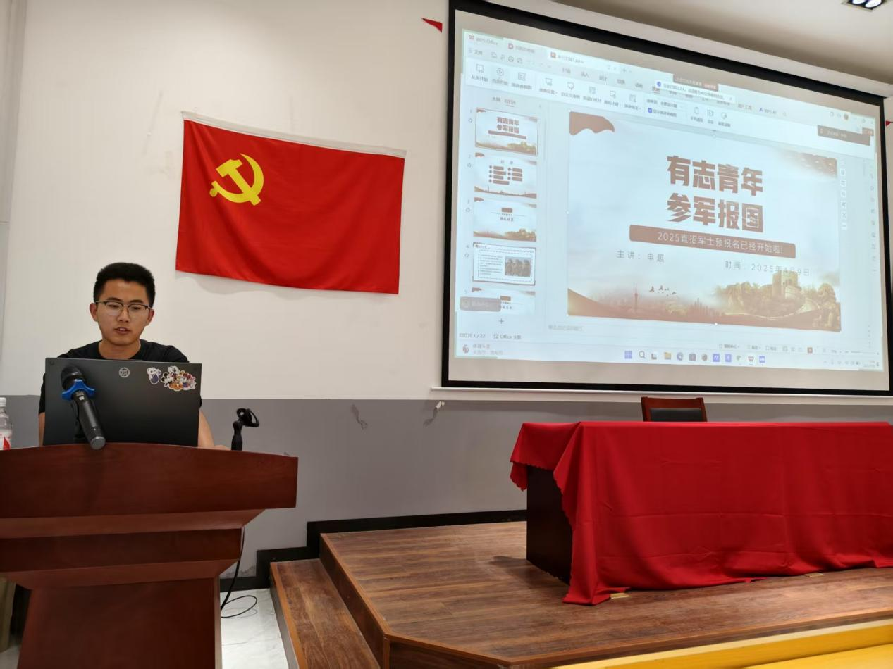 4月10日,yl6809永利检测中心国防社于阶梯教室召开直招士官专题分享会。分享会由退役士兵申超主讲。