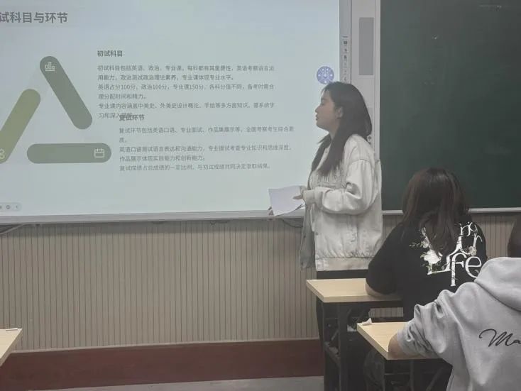 考入山东艺术学院陶瓷艺术专业的袁英帅同学,从考研择校、考研政治、考研英语等多个方面分享了考研经验。针对考研政治与考研英语方面,她详细说明了自己的备考经历,从选择题跟主观题方面提出学习方法,选择一本资料并构建学习环境,同时要强化答题、模拟、真题训练。在专业课的规划中,首先要基础构建,第二阶段要强化训练,同时注重专业课的平时作品,为后期的作品集做铺垫。她还强调要学会情绪管理并找到自己的节奏,并提醒同学们一定要多读多记多练,坚持到最后一刻。