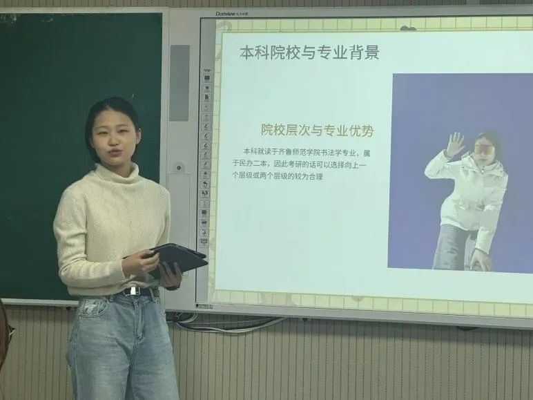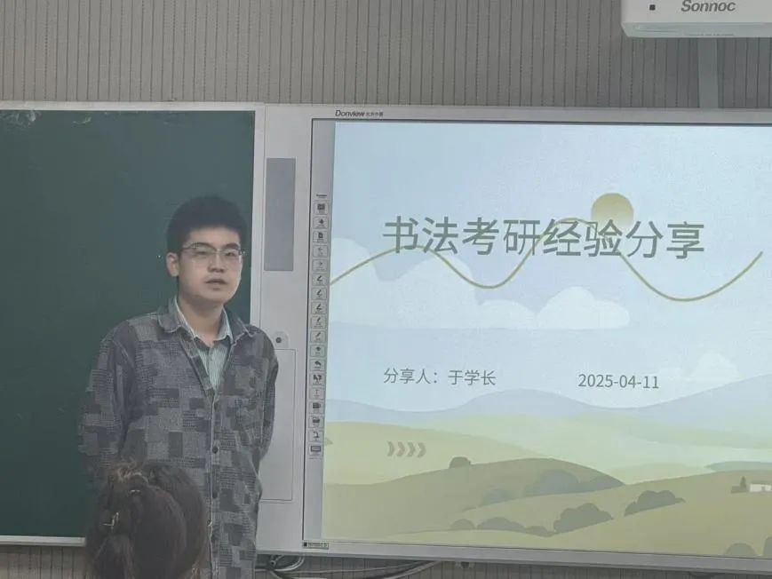 考入首都师范大学美术与书法专业的陈月瑶同学,提出考研与本科相呼应,谈到考研规划、各科备考经验、心理调整、复试准备等方面深入浅出,在院校目标选择上要关注考研动机、意向报考地区、报考学校的考试内容与出题风格、喜欢的导师或研究方向,从自身经历强调整体时间规划,把握英语、政治、专业课的复习策略。最后她向学弟学妹提出忠告要警惕虚假努力,筛选焦虑信息,最重要的是保证健康管理。