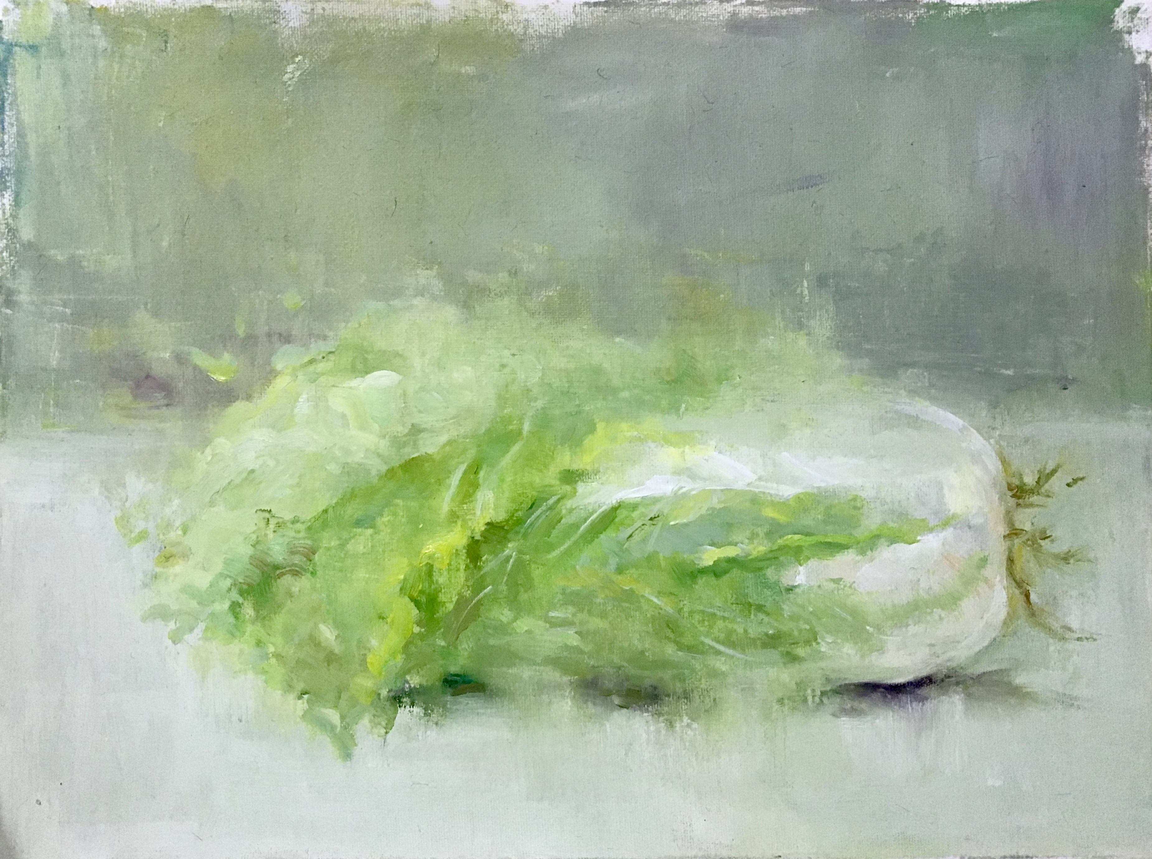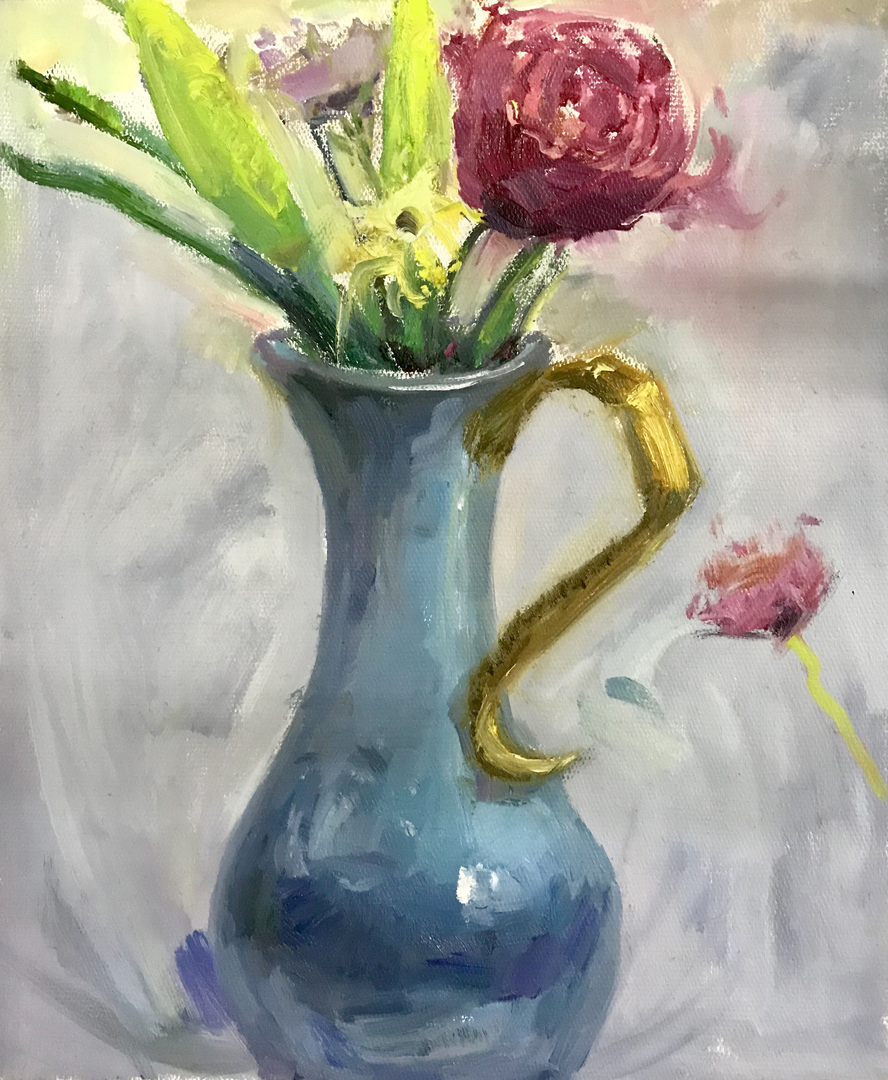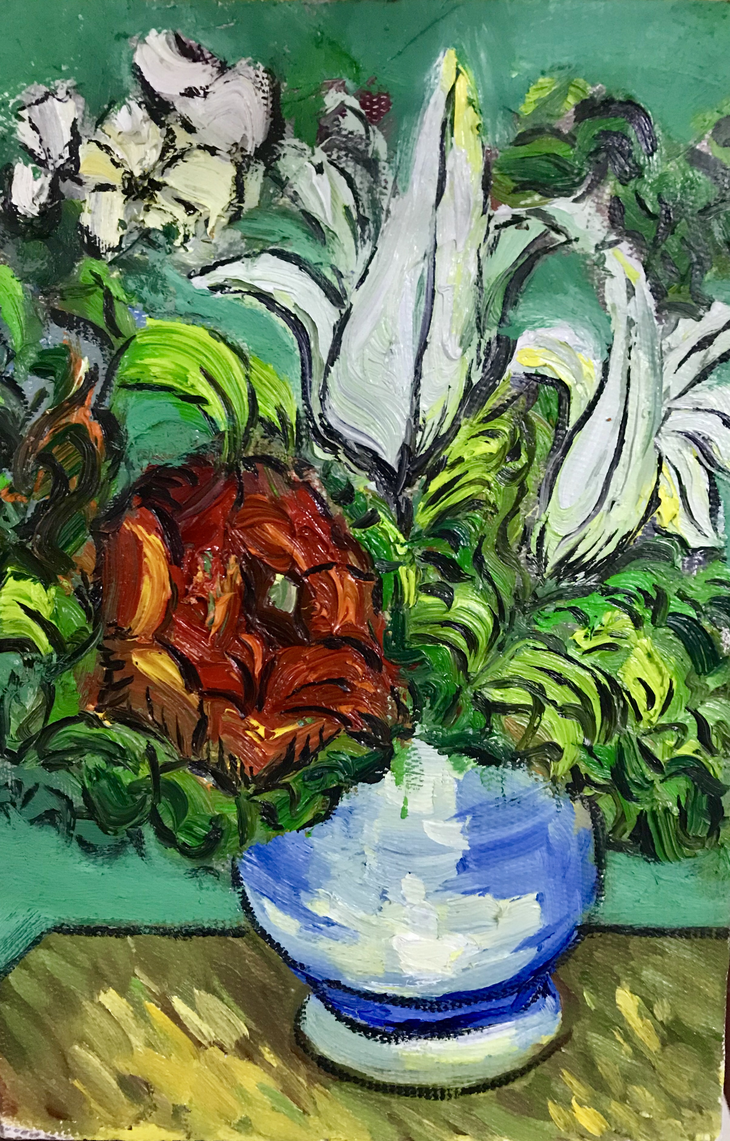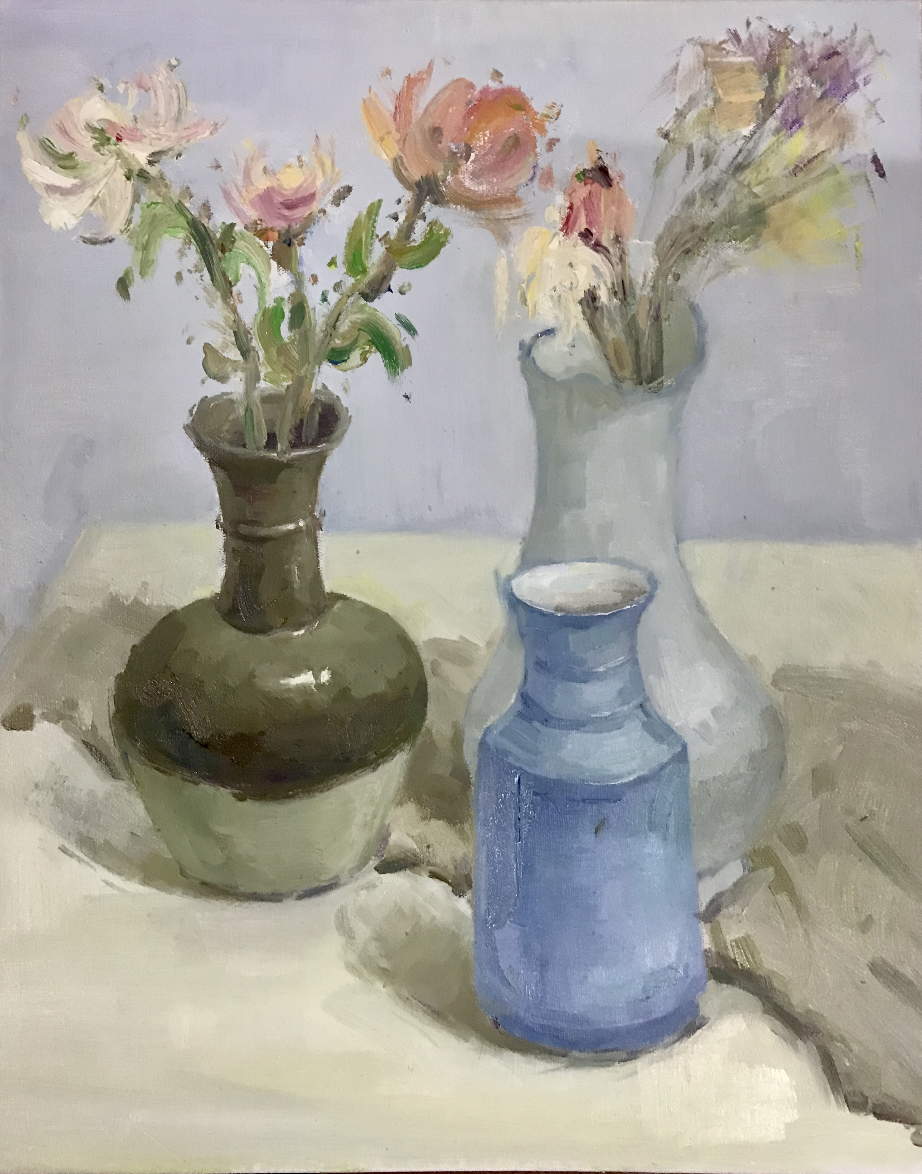 三是写生,参照实物,将自己的心绪浸染,付诸笔端,倾注情感。对稀松平常的静物自主创作,写生期间明亮老师还多次为同学们作范画指导,提升对油画的感知与理解。