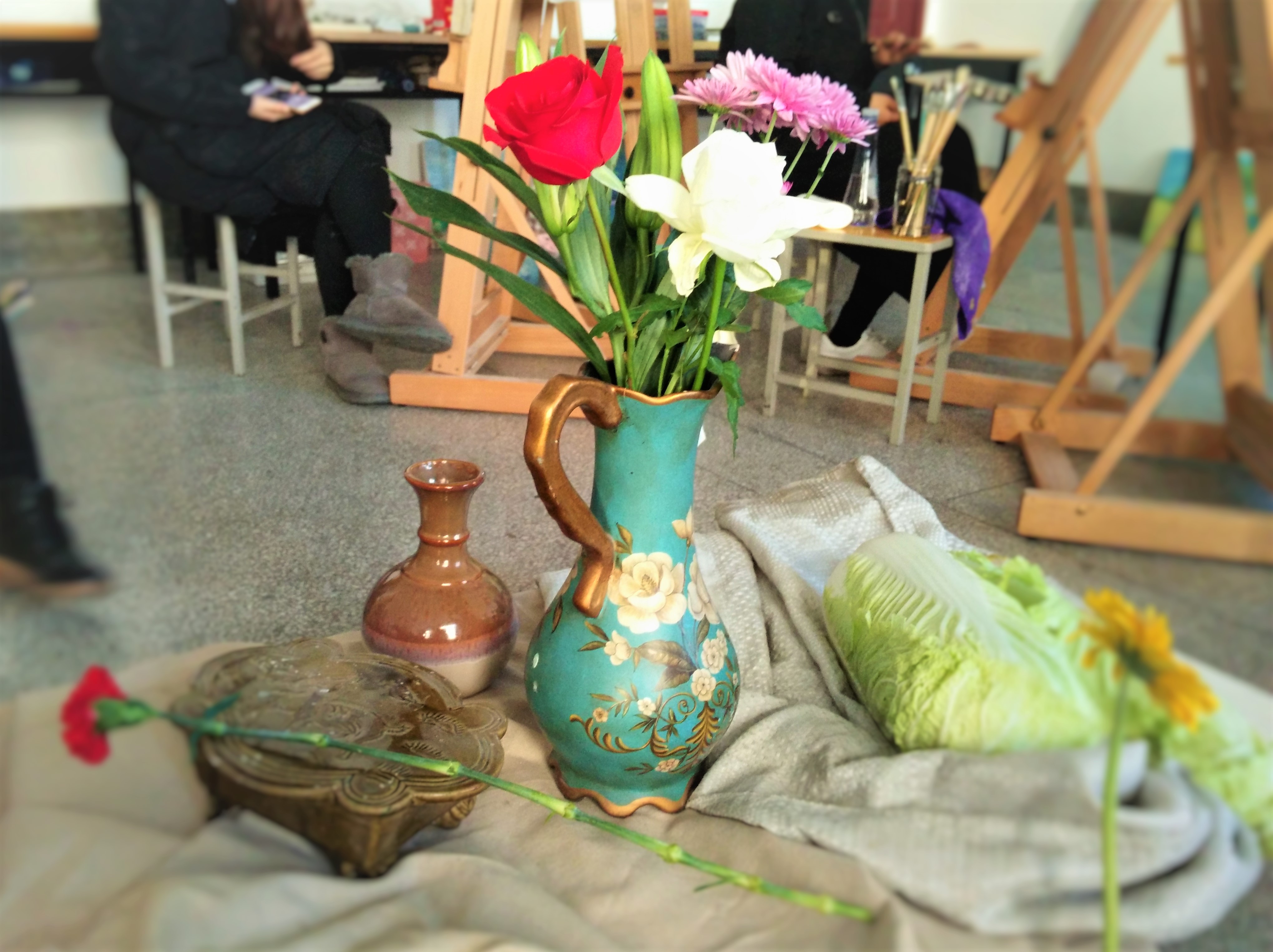 《诫子书》有言:非淡泊无以明志,非宁静无以致远。在明亮老师的课堂上,几支鲜花,散插在花瓶中;三两白菜,斜靠在衬布前。单就看着,就有一种真挚淳朴的美。同学们围坐四周,清风徐来,大美无言。只有落笔的簌簌轻响,昭示着专注与认真。